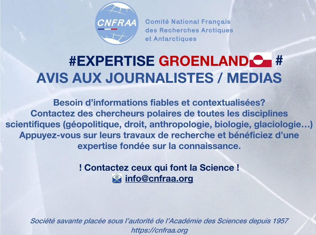 Are you a journalist looking for reliable, contextualised information on Greenland and the polar regions in light of current geopolitical events? Contact the CNFRAA and its many researchers from all scientific disciplines: geopolitics, law, anthropology, biology, glaciology, etc. You can draw on their research for your analyses and benefit from expertise based on knowledge.