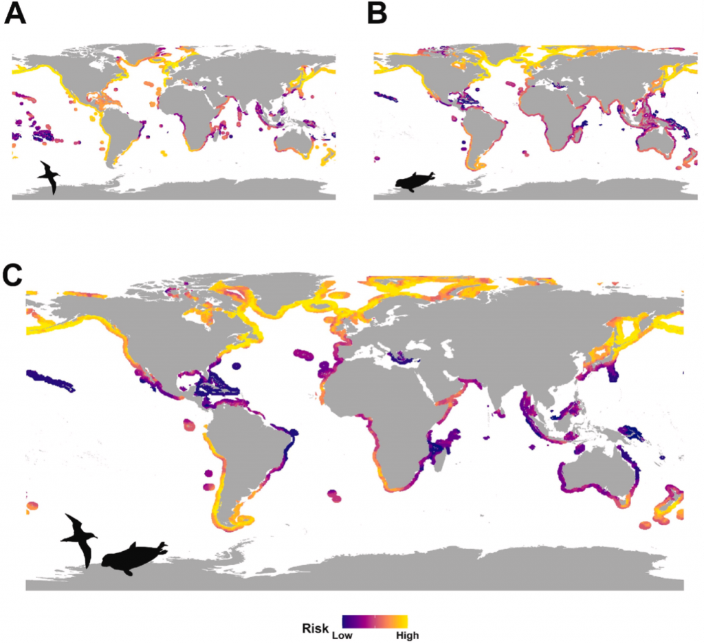 Regions of the world where offshore wind development projects overlap with likely feeding areas for seabirds with restricted ranges (A), marine mammals (B), and both groups combined (C). The brighter the colour, the higher the potential risk to wildlife. © Morant et al., 2025