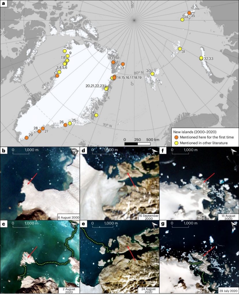 Map and examples of new islands detected between 2000 and 2020 in the Arctic. © Kavan J., et al., 2025