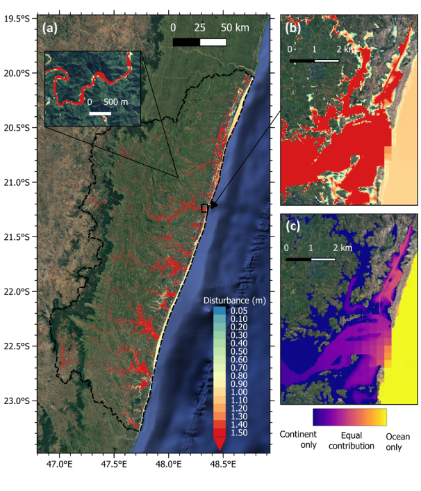 Flooding reproduced by the model during Cyclone Batsirai (a) across the entire Mananjary watershed, with the inset showing the fine-scale structures of the flooding. Panel (b) shows the extent of flooding in the town of Mananjary. Panel (c) shows the relative contribution of oceanic and continental factors to flooding in the same area. © Khan, M.J.U., et al. 2025