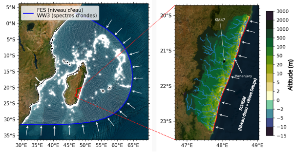 Faced with the complexity of the floods observed in Madagascar, researchers have designed a novel numerical modelling system capable of simultaneously representing oceanic and continental dynamics. This system combines two complementary tools: the SCHISM-WWM model to simulate phenomena at sea, and the SFINCS model to model flows on land.