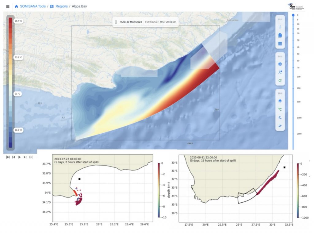 Portal for the bay forecasting system developed by SOMISANA in South Africa, integrating water table monitoring with OpenDrift. © M. Cirano et al., 2025
